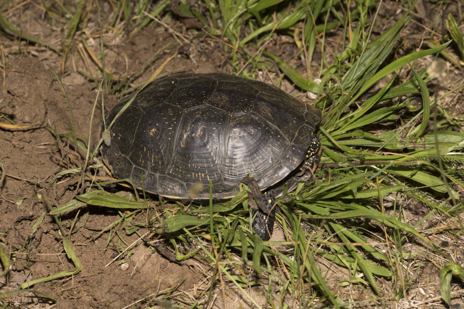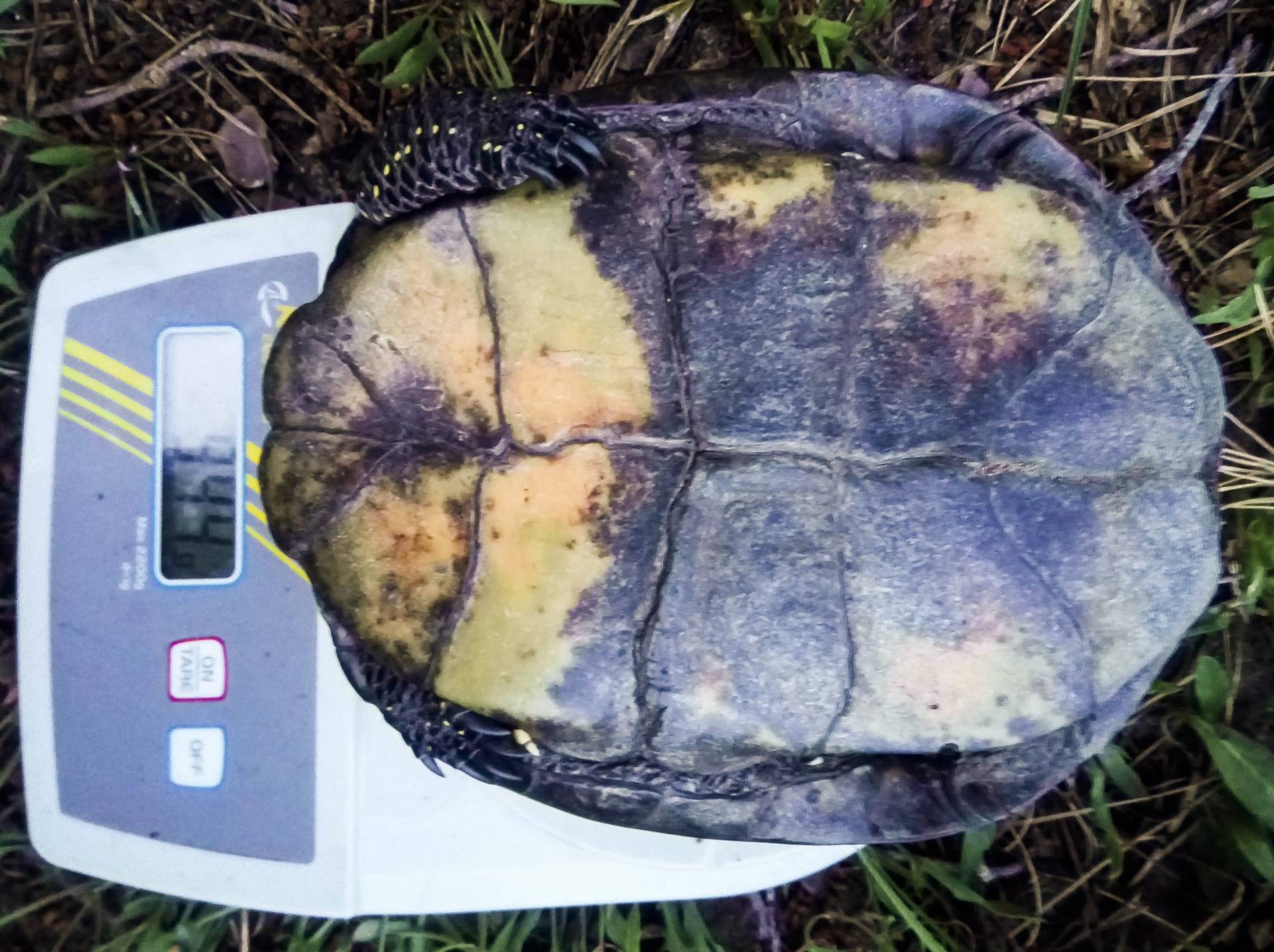 Die Schildkröte wurde mittels Digiskopie im Freiland dokumentiert. Auf dem Bild ist zu erkennen, dass der Schwanz des Tieres abgebissen wurde.