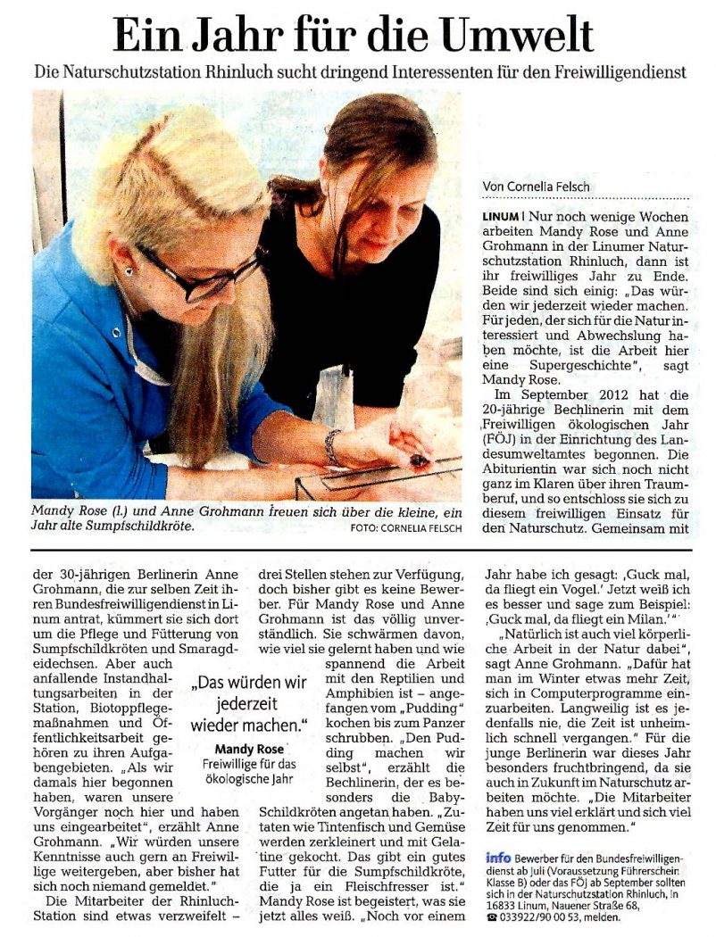 Das FÖJ richtet sich an alle jungen Menschen zwischen 16 und 26 Jahren, die Lust haben, sich freiwillig (nur mit einem monatlichen Taschengeld) ein Jahr lang im Umweltschutz zu betätigen. Man beteiligt sich in dieser Zeit als Mitarbeiter in seiner Einsatzstelle und bekommt von dieser auch eine Unterkunft gestellt. Das FÖJ gibt es seit 1990. Es wird gefördert vom Ministerium für Umwelt, Naturschutz und Raumordnung des Landes Brandenburg und dem Bundesminesterium für Familie, Senioren, Frauen und Jugend. Mehrere Trägerwerke leiten ihre FÖJler durch das Jahr und organisieren die fünf einwöchigen Pflichtseminare. Die Seminare behandeln umweltpolitische oder ökologische Themen wie Energiewirtschaft, extensive Landwirtschaft, Tourismus und Natur usw.. Die Einsatzstellen sind so vielfältig wie Sand am Meer: Von Biobauernhöfen über Jugendbildungsstätten bis zu Naturschutzstationen wie uns. Ein FÖJ hilft, erste Erfahrungen mit der Arbeitswelt zu machen und wird oft als Vorpraktikum für einige Ausbildungsberufe im Umweltbereich anerkannt.